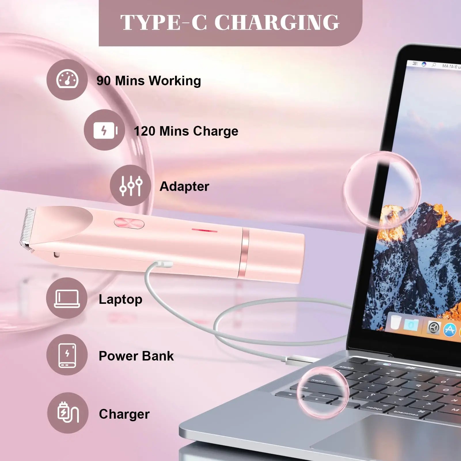 Enjoy fast charging via type-C technology – fully powered in just 2 hours. With up to 90 minutes of cordless use, it's perfect for on-the-go grooming. Compact and portable, electric bikini shaver for women slips effortlessly into your purse or makeup bag for travel-ready convenience.